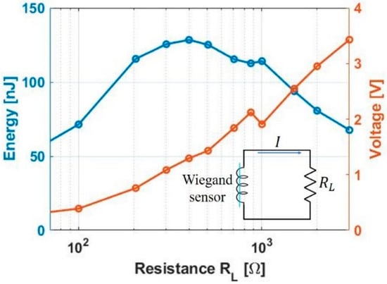 Energy generation using a single Wiegand voltage pulse is shown in Figure 3, in which the load resistor RL is connected in series with the Wiegand sensor for extremely low rotational frequencies. The voltage drop across the load resistor RL is plotted by varying the value of RL (Figure 3). The energy consumed in resistor RL is calculated by the time integral of I2RL for each pulse, and the maximum energy consumption reported is 130 nJ for RL = 400 Ω.