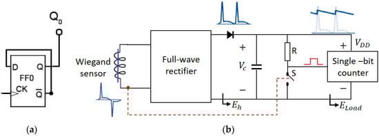 In the developed scheme, a D flip-flop is powered continuously using a simple capacitor-based circuit. Furthermore, each Wiegand pulse powers a simple hardwired logic circuit, such as that of a nonvolatile ferroelectric random access memory (FRAM) element []. This logic performs a “+1” increment, stores the updated value, and finally powers the device to the OFF state using the energy harvested by the Wiegand sensor. In order to implement fully functional self-powered sensors with wireless transmission, one can charge the battery and transmit the stored data when the power required to drive an ultralow power transmitter is available, which will be realized in subsequent research.
