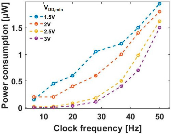 Po is the output power that is determined from the load requirements. CD4031B power consumption is a function of both the clock frequency and the supply voltage [], assuming the load operates in the VDD,min to VDD,max voltage range; thus, it is measured by varying the clock frequency generated by the Wiegand sensor and by the external power supply at various VDD,min values. The power consumption in the D flip-flop increases as a function of the clock frequency, as shown in Figure 6. However, as VDD,min increases, the power consumption decreases comparatively. Therefore, the capacitor must be selected by considering the minimum power required to operate the D flip-flop at the lowest frequency. In this case, the output power Po required to drive the D flip-flop is about 0.1 µW for VDD,min = 1.5 V. By substituting the value for minimum f (i.e., 1 Hz) into Equation (8), the optimal value of the capacitor C is determined to be 0.1 µF. The energy delivered to the load is ~38 nJ, which is in good agreement with the maximum energy generated of 130 nJ per pulse.