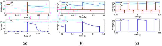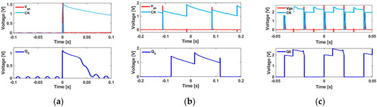 As shown in Figure 7, the active rectifier [] is implemented with two N-channel [] and two P-channel [] metal-oxide-semiconductor field-effect transistors (MOSFETs). The circuit parameters used for this implementation are listed in Table 1. For each positive peak, the capacitor C charges up to voltage Vc, which supplies power to M1 and the D flip-flop. M1 is operated by the positive peak of the Wiegand sensor, as shown in the waveform of Vgs. The output across M1 provides the clock signal to the flip-flop and is indicated as CK in the obtained waveforms. As the D flip-flop is a positive-edge type of triggered flip-flop, one square wave cycle is generated at Q0 for a single rotation, as shown in Figure 8a. In this study, the rotational frequency varied from 1 to 50 Hz. Figure 8b,c show the D flip-flop Q0 outputs for excitation frequencies of 5 and 50 Hz, respectively.
