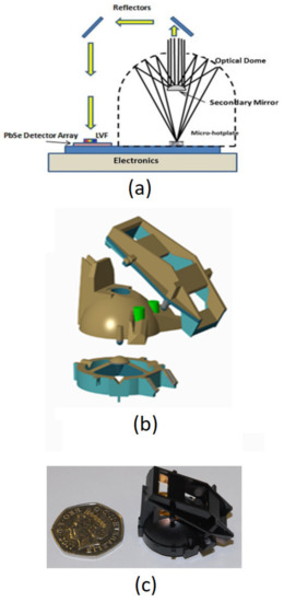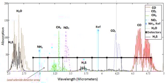 An optical design based on a Schwarzschild configuration [24] magnifies the optical source output, matching the spatial input to a lead selenide array of detectors [25]. An optical filter (described in detail in Section 2.4) placed on the detector array provides spectral discrimination across the array elements. A basic representation of the sensor is provided in Figure 1.