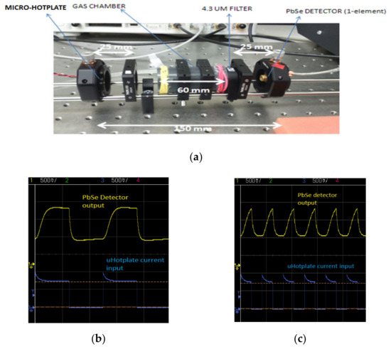 (a) Demonstrator setup for gas detection with 25 mm optical lenses, (b) output with the hotplate driven with a 4 Hz square wave, and (c) output with hotplate driven with 12 Hz square wave.