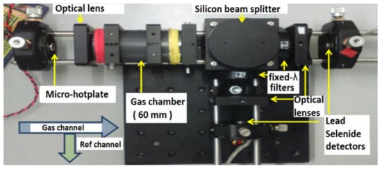 Realisation of an NDIR sensor based on spectral differentiation requires the following—(1) a mid-infrared source providing broadband radiation covering the wavelength range of interest, achieved by the use of a blackbody source emitting a broadband infrared spectrum; (2) an optical filter discriminating specific wavelengths from the incident radiation (the present work explores the usage of both fixed line pass band optical filters and linear variable filters for achieving spectral selection); (3) the ability to modulate the source to maximise signal/noise ratio; (4) a photo detector sensitive to IR radiation in the spectral range covering absorption wavelengths of the gases of interest.