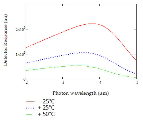 The variation of detectivity D* with temperature is then modelled for 0 °C, 25 °C and 50 °C, as shown in Figure 7. The ability to achieve spectral control for both the source and the detector is critical for ensuring accurate compensation while detecting gas. The source-detector product is of particular importance and represented as shown in Figure 8, fitting into the MWIR spectral range of interest.