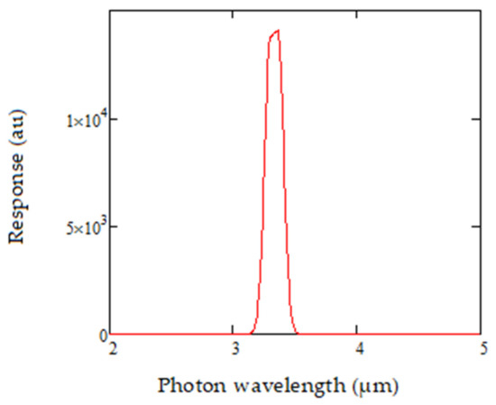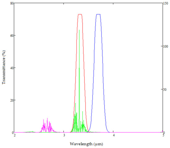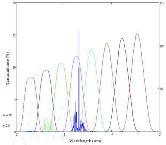 The model can switch between a linear variable filter and a fixed-line pass band filter to be the spectral differentiator in the sensor assembly. The manufactured LVF’s have a spectral range of 2.9 to 4.8 µm, with a pass band width of 1.5% and peak transmission of 70%. The LVF transmision is modelled as a Gaussian distribution around the central wavelength of interest. The transmittance at the centre of each of the detector element is averaged to yield a spectrum shown in Figure 9—with lower average transmittance, as expected, at the lower end of the wavelength range and higher average transmittance at upper wavelengths [35].