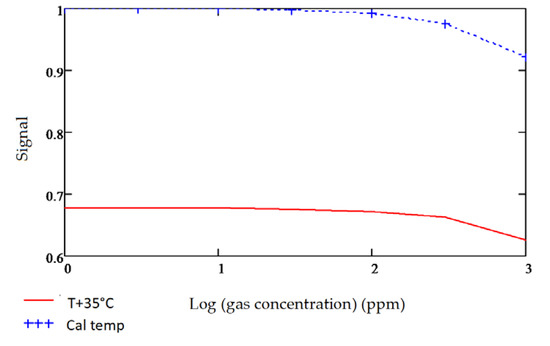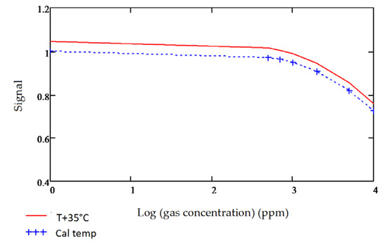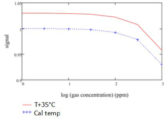 It was observed during gas sensitivities modelling that the bandwidth and central wavelength of the fixed filters used are critical to maintaining an acceptable level of temperature offset between the signal and reference channel output signals. The reference channel is designated mainly to account for temperature-related corrections. Inherent output shifts due to the nature, quality and position of the filter used are disruptive and should be corrected by strategically designing the signal and reference filters for each gas. The importance of this is illustrated in carbon monoxide detection modelling, as shown in Figure 16a,b below.