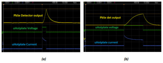 (a) System output with hotplate pulsed at 5 ms and (b) System output with hotplate pulsed at 25 ms.