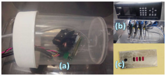 (a) Gas sensor custom-built chamber; (b) Mass Flow Controllers for gas mixing; (c) Aluminium-based filter array holders for testing fixed-line passband filters.