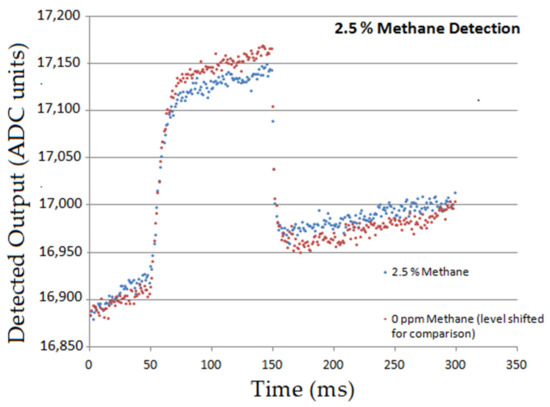 - Methane was detectable at 100 ppm, 500 ppm and 25,000 ppm (below lower explosive limit)—but longer sampling times and faster sampling techniques are required as these improve detection by compensating for the noise fluctuations in the system. Figure 15 shows how the PbSe detector output indicated 2.5% Methane detection.In addition to methane, the following performance for CO2 and CO observed: