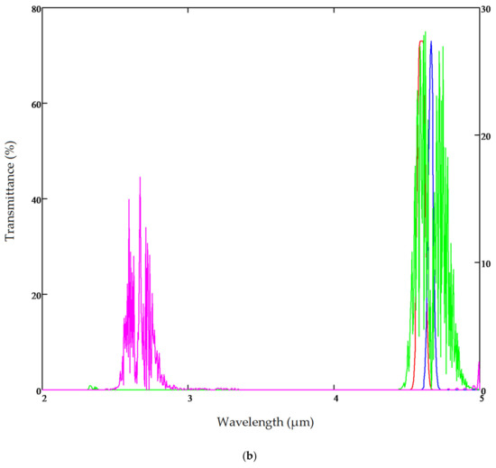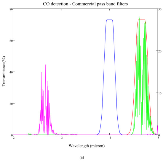 (a) Design A: CO filter transmission using 480 nm wide commercially available signal [37] and reference filters. (b) CO filter transmission using 100 nm wide in-house designed signal filter and reference filters [33].