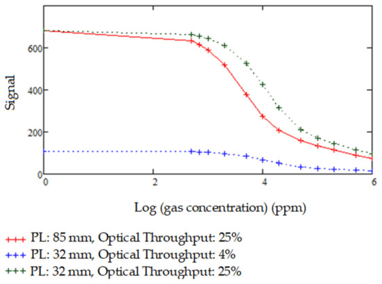 For detection of moderately high to very high concentrations of gases which possess strong IR-absorption characteristics such as CO2 and CH4, the path length of the cell needs to be designed carefully to avoid saturation of the gas cell and avoid 100% absorption. Impacts of varying path lengths and effects of using designs with different optical throughputs on gas detection, as well as the Signal-to-Noise ratio (S/N) of the sensor, were investigated by modelling for CO2 as shown in Figure 19 below, for varying path lengths and optical throughputs: