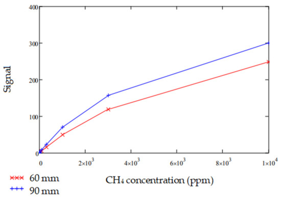 Change in signal modelled for different path lengths 60 mm and 90 mm for CH4 gas concentrations below 10,000 ppm.