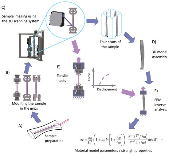 Flow diagram depicting the experimental process starting from the preparation of the samples (A), through mounting of the sample in replaceable inserts (B), scanning of the sample using the 3D scanning system (C), development of the 3D CAD model (D), up to the estimation of material model parameters using finite element method inverse analysis (F) based on force-displacement curves from tensile tests (E). Tensile tests were performed using the same gripping inserts that were used during 3D scanning of the sample, without changing the boundary conditions.