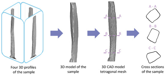 Development of the 3D model of the sample from four 3D profiles scanned every 90°. The profiles were assembled into a single 3D surface model considering concavities, followed by the generation of the tetragonal mesh for further computational strength analysis. Geometry of the sample with a variable cross-section is shown.