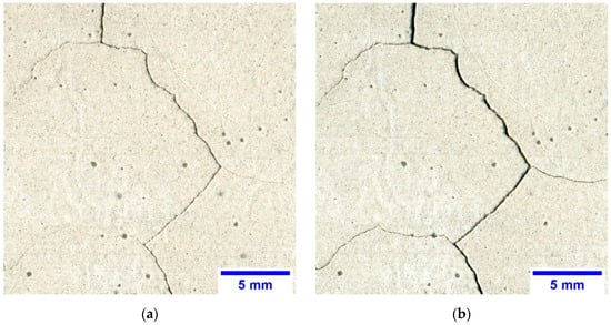 Cracks visible on the surface of the cement matrix after the thermal loading are the result of several factors, i.e., deformations in the form of an increase in material volume due to the heating, shrinkage due to the cooling, bursting action of water vapor under pressure, and chemical transformations in the form of decomposition and dehydration of some cement phases. However, in the range of thermal interaction from room temperature to 450 °C, the most cracks that form and become destructive, are caused by the physical changes of the cement matrix occurring in the form of deformations [,,]. Figure 1 shows the same fragments of cracked surface of the cement matrix. There is a clear difference in the morphology of the cracking pattern between the two series as well as between the first and second phase of the thermal load.