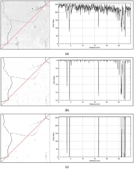 In order to assess the degradation of the cement composite, a cracking pattern analysis can also be performed on its surface [,,,,,,,,,,]. However, a cracking patterns analysis is problematic for methodological reasons because the simplest localization and tracking methods (e.g., portable measuring microscope for measuring crack opening width) are burdened with a large measurement error related to the human factor. Much more accurate and reliable crack analysis methods are based on a digital analysis of a cracked surface fragment of a cement composite. However, the main problem of methods based on a digital image analysis is the correct separation of cracks from the rest of the material. The most common reason for this is the poor contrast between the cracking patterns and the undamaged part of the cement composite, because the cracks appear as black lines on a grey background. At present, with the progressive development of digital technologies, considerable development of research methods in this area can be observed.