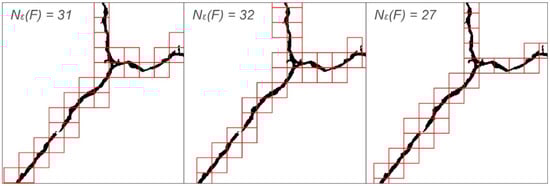 In the study, the fractal dimension of the cracking patterns (CP-DB) by the box-counting method was measured. The FracLac plugin for ImageJ was used []. For a single sample, the measurement was performed 12 times, after which the final result was the average of these measurements. Each single measurement was taken at a different grid orientation. This results in a more reliable result for the whole sample. It may happen that with the same calibre of the grid, the number of boxes containing significant pixels will be different depending on the grid orientation, as shown in Figure 4. During the measurements, a linear increment of the grid calibres was used, when sampling in 100 different grid sizes, i.e., from 5 to 818 px. The size of the largest sampling element was defined as 45% of the length of the shorter edge of the image. Graphically, the fractal dimension is defined as the slope of the regression line on a graph that shows the number of boxes containing significant pixels at different grid sizes as a function of the grid size. This is equivalent to the equation:
