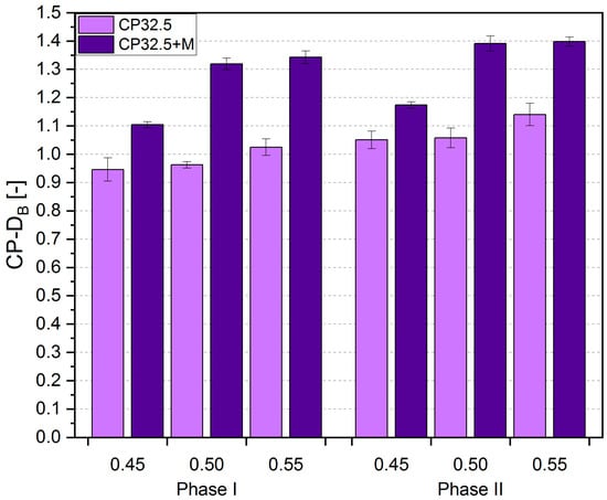 Analyzing the development of the cracking pattern between the first and second phase of the thermal load, the same relationship was noted as for TCA and CD (Table 3). Despite a much more developed cracks structure in the CP32.5 + M series, the addition of MS relatively limited the development of cracks after repeated thermal loading. The increase in CP-DB values for the CP32.5 ranged from 9.9–11.2%, while for the CP32.5 + M the increase was half that and was equal to 4.1–6.3%. No clear influence of the degree of concentration of cement grains on relative differences in CP-DB between the first and second phase of the thermal load was observed. The use of CP-DB to describe the surface structure of cracks is very beneficial from the statistical point of view. Out of all three parameters, i.e., TCA, CD, CP-DB, the results of CP-DB are characterized by the lowest variability because the coefficients of variation for TCA ranged from 3.1–20.3%, for CD 1.3–11.0%, and for CP-DB 0.9–4.4%. This means that even small but statistically significant differences in the structure of the cracking patterns between samples can be captured with very high accuracy.