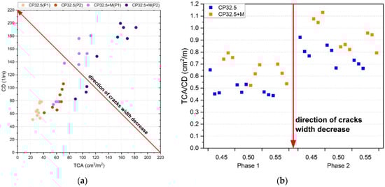 The parameter that determines to a large extent the degree of degradation of the cement composite is the width of the crack opening. From the data obtained from the image analysis, this property can be relatively presented in the form of the relation between TCA and CD, as shown in Figure 8a. When the surface occupied by cracks decreases with a simultaneous increase in the density of cracks, this indicates that a single crack has an increasingly smaller surface area, i.e., the width of its opening relatively decreases. The direction of change of this relationship is shown on the figure as a red arrow. The relative average opening width of the crack can also be shown as the TCA/CD ratio (Figure 8b), which is a more transparent representation of the change of this property and gives the possibility to make a comparative analysis. The results of the CD indicate that with the repeated thermal load, new cracks are created in a certain number, but mainly develop and propagate the existing ones. A situation of this type is consistent with the principles of the fracture mechanics, because much more energy has to be supplied to the system in order to create a new crack, compared to the amount of energy, which causes the propagation of the already existing crack [,,]. The analysis performed indicates that after the second phase of the thermal load the relative average crack opening width is higher by as much as 47.8% in comparison with the state after the first phase.