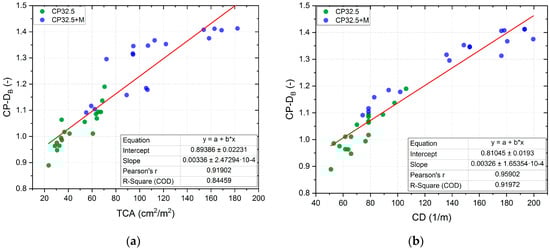 Analysis of the linear regression of CP-DB in function of: (a) TCA; (b) CD.
