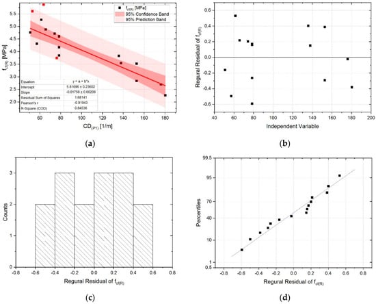 For the two most strongly correlated relationships, i.e., CD(P1)-fcf(R) and CP-DB(P1)-fcf(T), a linear regression analysis was carried out and the evaluation was performed of the degree of accuracy of tensile strength estimation for both standard samples and those degraded by the influence of elevated temperature. Figure 10 shows the results of regression analysis together with residual plots for the CD(P1)-fcf(R) relation. During the analysis 3 outliers were identified, which differed significantly from the fitted regression line—they were marked in red and were not included in the analysis. The exclusion of these points from the analysis resulted in an increase in the Pearson correlation coefficient, in the negative correlation range, from −0.87 to −0.92. Although two of the three outliers points were within the 95% prediction band, they were characterized by the highest residuals values. The final linear regression line obtained is characterized by a very good degree of fitting to the empirical data, which are covered in 85% (R-Square = 0.85). Equation coefficients, both slope and intercept, are statistically significant at a level of statistical significance α = 0.05 (intercept p-value = 2.68 × 10−12; slope p-value = 1.25 × 10−6). The residuals distribution is characterized by a constant variance pattern, which confirms a good quality of the regression model. Variance of residuals is normally distributed, which confirms the correctness of the assumptions made for the regression model.