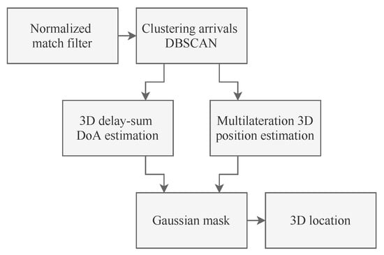 We configured DBSCAN to seek arrivals detected in at least 70% of the array elements, and spaced in time no more than the maximum propagation delay between any two elements. This makes it possible to discard peaks that are not detected reliably by all elements, or that are separated by a large time delay, enough to suspect that they may correspond to different emissions from the environment, or to reflections from different targets. We remark that the threshold on the number of array elements that should detect target-related peaks configures a trade-off between the probability of missing a detection, and the probability of wrongly including a detection that pertains to a different target. In fact, some array elements may be shadowed by other sensors, cables, or structural components of the array, and therefore a cluster C may contain peaks from only a subset of the array elements. Additionally, if a cluster contains multiple arrivals within on the same channel, we have an option to filter the arrivals depending on the output of the normalized matched filter.