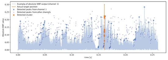 Using real data from a lake experiment, we show an example of clustering result for peaks collected by a synchronously-sampled 10-element array in Figure 2. The array is configured to seek linear chirp signals of duration 10 ms spanning the acoustic frequencies from 7 to 17 kHz. The light-blue time series in the background of Figure 2 is the output of the NMF for one of the ten acoustic channels, namely channel 1, depicted over time (measured in seconds). The sampling frequency is 62.5 kHz. For this channel, the peak extraction algorithm described above filters the peaks marked as a large blue circle. The same algorithm, applied to the NMF output of the remaining nine channels (whose time series are omitted for clarity), leads to the peaks marked as small, purple circles. Altogether, these peaks form set . DBSCAN processes the peak set to detect the target. Out of all peaks, DBSCAN singles out the orange-colored ones as being likely associated with the target, due to their density and their appearance in several acoustic channels. As confirmed by the vertical orange line, these peaks correctly align with the ground truth of the target’s position, which corresponds to a time of arrival of about 0.16 s.