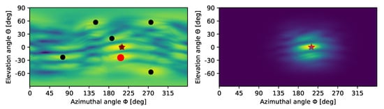 Figure 3 (left panel) provides an example of the delay-sum output. Specifically, for a number of 3D DoAs characterized by a pair of angles (azimuthal angle, x-axis) and (elevation angle, y-axis), we steer the array towards each DoA using wideband delay-sum beamforming, and depict the normalized amount of power at the output of the array. Yellow hues correspond to a strong signal, green hues to a signal of intermediate power, and blue hues to a weak or absent signal. Notably, there exist several local maxima (black dots surrounded by yellow-green hues), which make the decision ambiguous. In fact, measurement noise in conjunction with ambiguity would lead to a wrong estimate (red circle) of the target’s actual DoA (red star).
