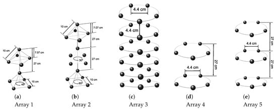 - Array 3 is a cylindrical array composed of 6 circular sub-arrays of 5 elements each (the same number of elements as in the pyramidal arrays of Array 1 and Array 2). The distance between closest elements along the same ring and across different rings is 4.4 cm;