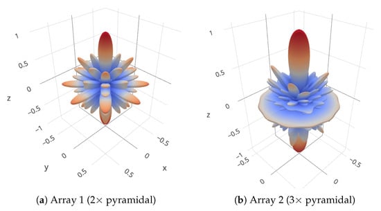 As an example of the ambiguity originating from the opportunistic array design and the suboptimal element spacing that ensues, in Figure 5, we show the 3D directivity pattern at frequency for Arrays 1 and 2, as steered towards the direction. In both cases, we observe several secondary peaks almost as strong as the tallest peak. These peaks originate primarily from the 27-cm spacing between subsequent pyramidal arrays, as such distance is about 7 times the appropriate spacing of 4.4 cm. In Section 5 and Section 6, we show that our algorithms still obtain meaningful location estimates even when using the equipment in the above configuration.