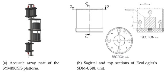 The acoustic array we deployed for this experiment is a part of the opto-acoustic system built in the scope of SYMBIOSIS project [] for the non-invasive monitoring of coastal and deep waters. The purpose of the platform is to detect, localize, and monitor fish stock from different target pelagic fish species, using a chain of acoustic and optical detection systems and algorithms. Figure 6a shows a rendering of the acoustic components in the upper portion of the SYMBIOSIS instrumentation. The top and bottom cylinders host control hardware and batteries to operate the platform, whereas the two cylindrical pieces of equipment facing right constitute the acoustic array considered in our experiment. Each cylinder contains a software-defined ultra-short baseline (USBL) with modem capabilities (SDM-USBL). Figure 6b shows the internal geometry of the unit via one sagittal and one longitudinal section. Each SDM-USBL consists of a modem transducer (at the geometric center of the USBL grid) and five receive hydrophones that surround it. The hydrophones form a pentahedral, square-base pyramid having side length of 10 cm, with one hydrophone per vertex. A set of commands enables the control of each SDM-USBL. Relevant capabilities include: (i) storing a user-defined signal with a duration of 1024 samples (two bytes per sample) with a sampling frequency of 62.5 kHz; (ii) setting the unit into a listening mode, where each hydrophone digitizes its received sound signal synchronously and stores the corresponding samples into a buffer holding 51,200 samples per channel; the sampling rate is user-defined, although the default rate of 62.5 kHz perfectly suits our deployment; (iii) reading acoustic data from the buffers; and (iv) transmitting the stored signal through the central transducer.