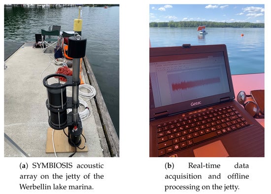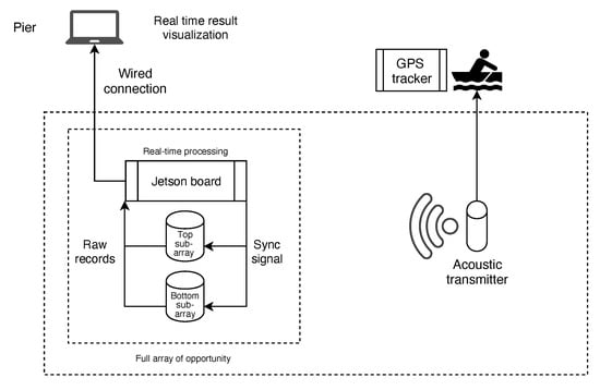 With reference to the scheme in Figure 7, we control the equipment from the laptop ashore (see also Figure 8b) using custom Python software. Once we issue the sync-in signal, the Jetson board collects data in real time, and uploads them to the laptop ashore. The software then processes the acoustic time series through the procedure of Section 3 to obtain DoA estimates.