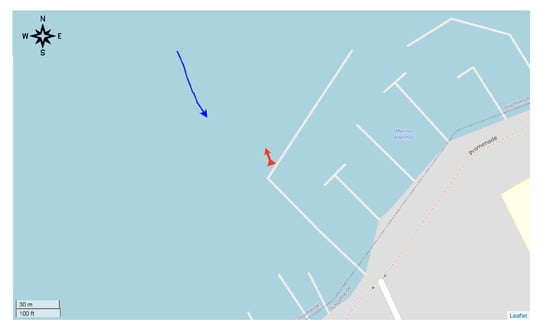 Figure 9 sketches the deployment configuration: we lowered the SYMBIOSIS unit in the water near the jetty of the Werbellin lake marina (Figure 8a), and placed it on the lake bottom at a depth of 7.5 m, so that the two units that constitute the array of opportunity remained submerged at a depth of 6.7 m and 7.1 m, respectively. The red arrow in Figure 9 denotes the location of the equipment and the reference (i.e., 0) direction of the acoustic array. Additionally, we deployed a small motorboat carrying an active target, namely a software-defined modem emitting linear chirp signals with a duration of 10 ms in the 7–17 kHz band. The target transmitted one such signal every 2 s. The objective of this setup is to mimic the behavior of autonomous underwater vehicles that issue heartbeat signals at fixed intervals, in order to signal their presence and operational status. The task of the array is thus to estimate and track the bearing of the chirp source. In our experiment, the depth of the active target is assumed to be known, and is fixed to approximately 8 m. This is coherent with, e.g., the detection of underwater vehicles or similar equipment, which typically embed accurate depth sensors, and can communicate the corresponding data. An operator paddled the boat with the target towards the acoustic array and slightly to the side throughout the experiment, as also seen from the ground-truth trajectory of the target (the solid blue line in Figure 9), and the reference orientation of the array (the red arrow in the same figure).