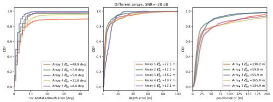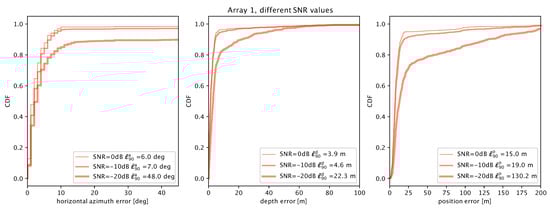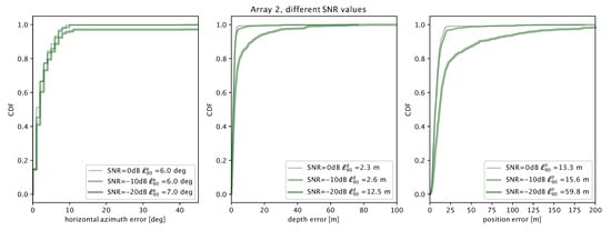 We analyze the performance of arrays 1 and 2 in more depth in Figure 11 and Figure 12, respectively. Here, we consider three different SNR levels of 0, and dB. For array 1, we observe that the accuracy decreases significantly only for the SNR level of dB, for which the azimuthal angle and the depth estimation errors concur to yield a large 90th-percentile error of about 130 m.
