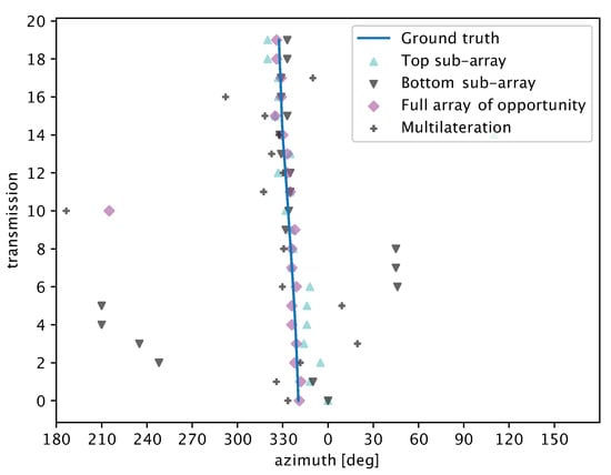 Results of the target localization experiment in the Werbellin lake using the SYMBIOSIS array of opportunity (cf. Section 4.3.1). While moving, the active target transmits every 2 s for 20 times. Each marker represents the azimuthal angle of arrival estimate (x-axis coordinate) for each transmission and for the corresponding array (light blue triangles: top sub-array; dark-grey triangles: bottom sub-array; purple diamonds: full array of opportunity). Grey “+” markers show the azimuth estimate yielded by multilateration. Our algorithm enables the opportunistic use of two pyramidal arrays, and makes it possible to improve the azimuth estimation accuracy with respect to using a single sub-array or multilateration per se.