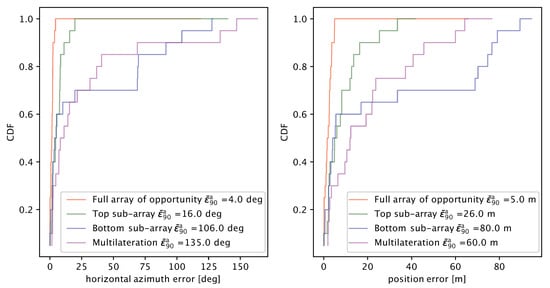 As expected, accurate azimuthal angle estimates translate into more accurate total location error estimates. In our experiment, we achieved a 90th percentile of the location error of 5 m using the full array of opportunity. This value is 5 to 16 times less than the error yielded by operating only the top and bottom sub-arrays, respectively, and 12 times less than the error yielded by multilateration.