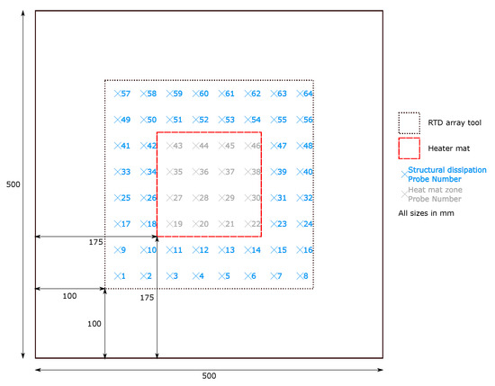 Figure 1. The 500 by 500 mm sample panel data capture set up with 150 mm × 150 mm heat zone (dashed red) and 300 by 300 mm RTD probe array (dashed black).