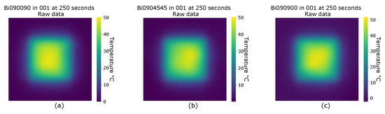 Figure 2. Heat maps of samples at 80 C and 250 seconds, (a) Biaxial 0/90/0/90, non symmetrical and balanced, (b) Biaxial 0/90/+45/−45, non symmetrical and unbalanced, (c) Biaxial 0/90/90/0, symmetrical and balanced.