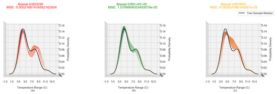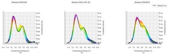 Figure 3a–c shows the Δ T distribution Biaxial samples with lay-ups of 0/90/0/90, 0/90/+45/−45 and 0/90/90/0 respectively. An overall KDE and its median KDE is computed for every second in the 150–300 time window for every sample (the solid line). The multi coloured region is a side view of the tri-surface plot of the density spread of individual samples as shown in Figure 4.