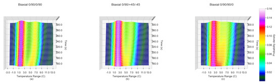 From Figure 3a the balanced non-symmetrical samples of 0/90/0/90 show a bi-modal distribution of temperature change which can be attributed to the fibre orientation interfaces between plies. For the second group of samples, unbalanced non-symmetrical 0/90/+45/−45, the transitions in fibre orientations are not as steep and consequently the second mode is attenuated. Finally, for the last group of samples, balanced symmetrical 0/90/90/0, the transition between the two slopes is even less steep than that of the unbalanced non-symmetrical 0/90/+45/−45. The significant feature of the KDE characteristic is the presence of two clear peaks evolving by the 300 second timestamp for all of the sample runs. The visualisation of the incremental KDE for each fibre orientation of one sample, accentuates the transitions over time. Figure 4a–c displays KDE plots at between 150 and 300 s for one sample of Biaxial 0/90/0/90, Biaxial 0/90/+45/−45 and 0/90/90/0 respectively. The transition into two distinct peaks for Biaxial 0/90/+45/−45 and Biaxial 0/90/90/0 (Figure 4b,c) becomes more evident. The KDE for Biaxial 0/90/0/90 balanced and non-symmetrical in Figure 4a displays two distinct peaks from 150 s to 300 s, with the transition of the secondary peak advancing along the Temperature Range C axis (x-axis).