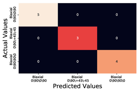 An example of the representation is shown in Figure 5b where the MSE is the lowest of the three and is thus coloured green, a true positive classification as this is the K D E ¯ / t generated for Biaxial 0/90/+45/−45. It is also clear on visual inspection that the median of the test sample of unknown fibre orientation (shown in black) sits completely in the K D E ¯ / t of Figure 5b. In order to quantify the effectiveness of the method the predicted results that the method generated were plotted against the actual values in a confusion matrix (Figure 6). The confusion matrix is traditionally used within machine learning to assess machine learning algorithms ability to correctly predict known test data against training data [21]. As the confusion matrix is designed to present how a Machine Learning algorithm is performing by plotting the predicted values in a grid format against the actual values this method allows for quick visual confirmation as to the performance of the method as well as any increase or decrease between modifications to the method. Within the confusion matrix four classification types can be produced;