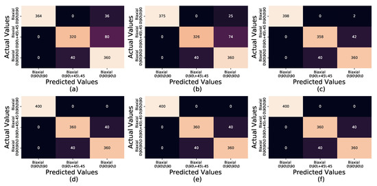 Figure 7. Confusion matrices of Biaxial 0/90/0/90, Biaxial 0/90/+45/−45 and Biaxial 0/90/90/0, for bandwidths: (a) 0.6 (b) 0.5 (c) 0.4 (d) 0.3 (e) 0.2 (f) 0.1.