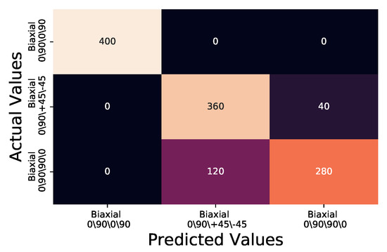 The results for Biaxial 0/90/0/90 and Biaxial 0/90/+45/−45 are comparable to those of the regular thickness samples at bandwidth 0.3 as shown in Figure 8 and Table 4. However Biaxial 0/90/+45/−45 has a reduction in precision from 0.9 to 0.5, due to False Positive identification of the Biaxial 0/90/90/0 samples as Biaxial 0/90/+45/−45, also reflected within the precision and recall scores of Biaxial 0/90/90/0 as 0.88 and 0.7 respectively. Overall, the accuracy between the normal thickness and the double thickness samples with random Gaussian normal noise applied at 0.1 bandwidth reduced from 0.93 in the regular to 0.87 in the double thickness samples.