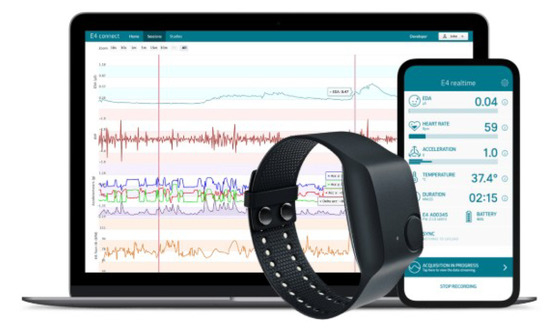 Empatica E4 Ecosystem implementing both computer (therapy management by the clinicians) and smartphone (data processing and display during patient use), retrieved from Reference [16].