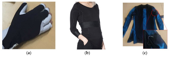 Besides the technical details, aesthetic, usability and comfort are also essential requirements for a wearable health device. To meet these requirements, researchers often develop smart textiles in scientific projects where additional sensors are implemented [11,13,17,20] or in projects where the aim is to track motion of a large part of the body, such as the trunk [7]. Generally, they use already existent pieces of clothing, such as socks [20], sport gloves [12,13] (Figure 2a) and swimsuits [7] or they produce new ones, for example. t-shirts (Figure 2b,c), trousers and gloves [11,17].