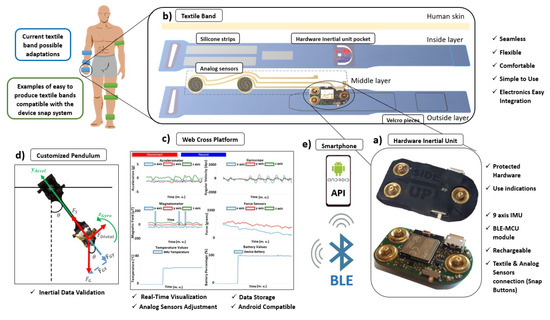 SnapKi wearable device surrounding system: (a) SnapKi hardware inertial unit exposed and coated. (b) Customized textile band for hardware inertial unit and analog sensors integration. (c) Web cross platform for data visualization and saving. (d) Customized pendulum for inertial data validation & device calibration. (e) Smartphone for data processing and visualization during patients use.