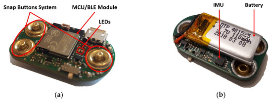 Hardware inertial unit: (a) Top view with the microcontroller unit (MCU)/ Bluetooth Low Energy (BLE) module, snap buttons system, on/off button and USB entry for device charging; (b) Bottom view with a small battery and the Inertial Measurement Unit.