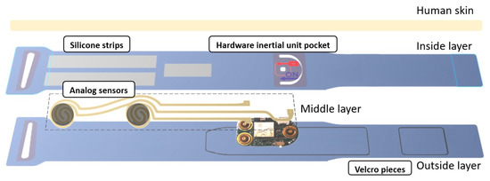 In systems where electronics are not integrated in textiles, researchers attach the components to the users’ bodies resorting to standard elastic bandages with Velcro applications [10,12,14] or other standard accessories [18].