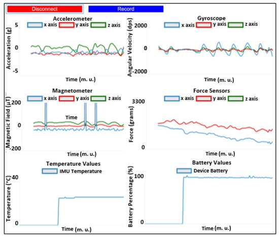 This intuitive and user-friendly web page (Figure 8) comprises two main buttons, a “Connect/Disconnect” button to start/stop receiving data from the device and a “Record/Stop & Save” button to start/stop recording data and proceed to its saving. Data is displayed in six graphs—one for each of the four sensors implemented in the device and two more to display temperature and battery percentage information.