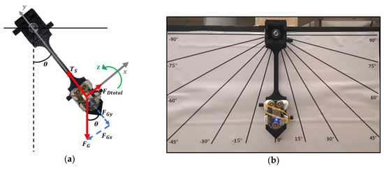 Customized pendulum for inertial data validation: (a) Forces diagram of the pendulum system; (b) Pendulum with the hardware attached and the marked angles behind for data acquisition.